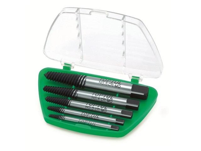 Набор экстракторов TOPTUL состоит из 5 инструментов диаметром 1/8", 1/4", 5/16", 7/16" и 9/16". Экстракторы предназначены для извлечения болтов с поврежденной или отсутствующей головкой. Набор упакован в пластиковый кейс.