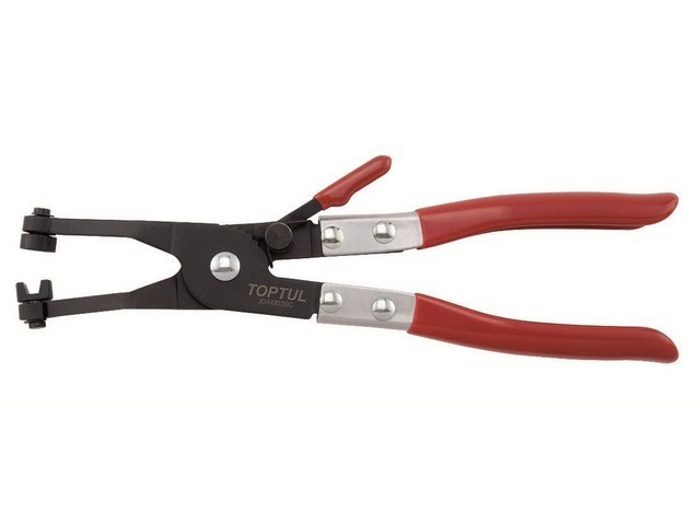 Съемник хомутов пружинных TOPTUL имеет фиксатор положения зажимов для большего удобства при работе, а 45° изгиб позволяет применять инструмент в трудно доступных местах. Рекомендуется для профессионального использования.