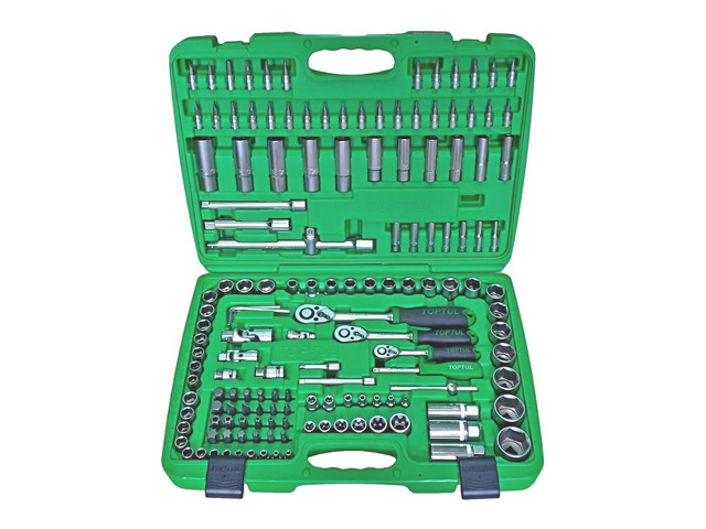 Один из самых полных наборов универсального инструмента на 151 предметов. Содержит три трещотки, стандартные и высокие головы, огромное количество бит и насадок, а также 3 свечные головки.