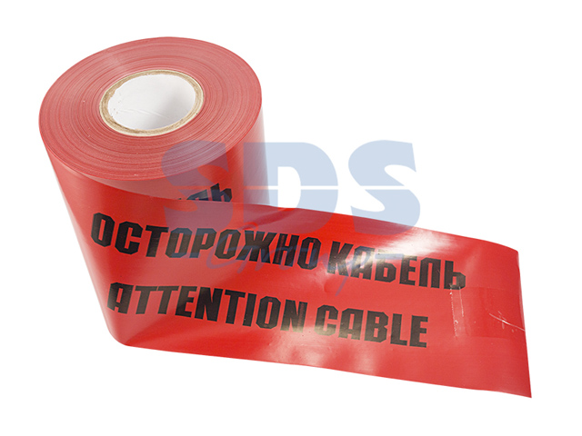 Лента сигнальная <Осторожно кабель> красного цвета, с нанесённым логотипом <Осторожно кабель. Attention cable> черного цвета.