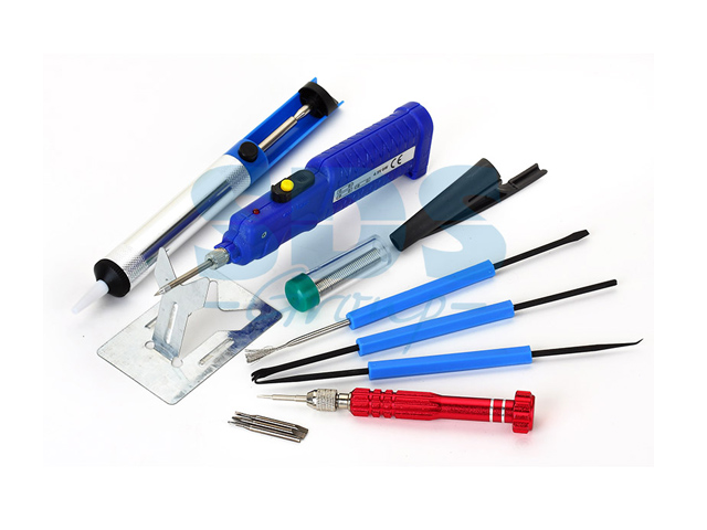 Набор для пайки (паяльник 8 Вт, оловоотсос, подставка, припой, отвертка, интрумент для монтажа) REXA (REXANT)