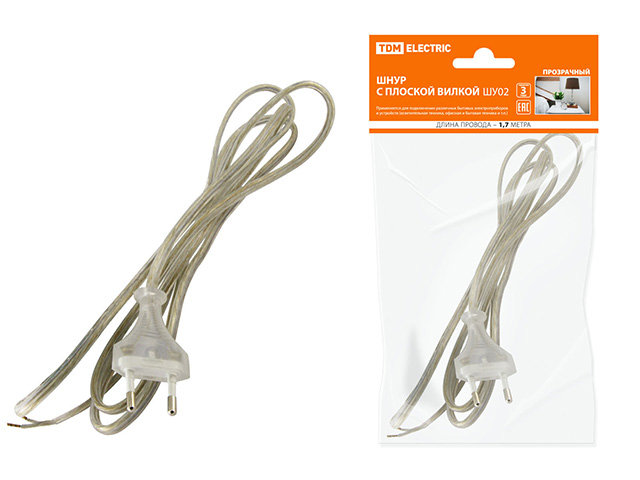 Шнур с плоской вилкой ШУ02 ШВВП 2х0,75мм2 1,7 м. прозрачный TDM купить в Минске:
