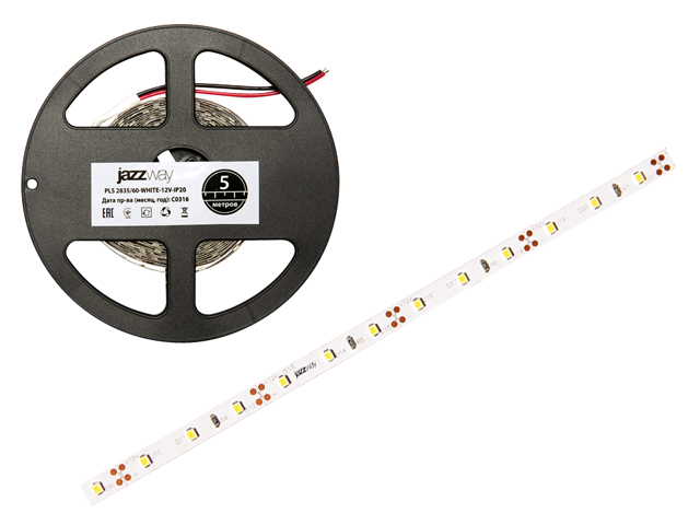 Лента светодиодная PLS 2835/60 (6 Вт/м, 480 Лм/м, IP20, 12В (5 м в уп.) красная JAZZWAY (60 диод/м, красный свет, 8 мм)