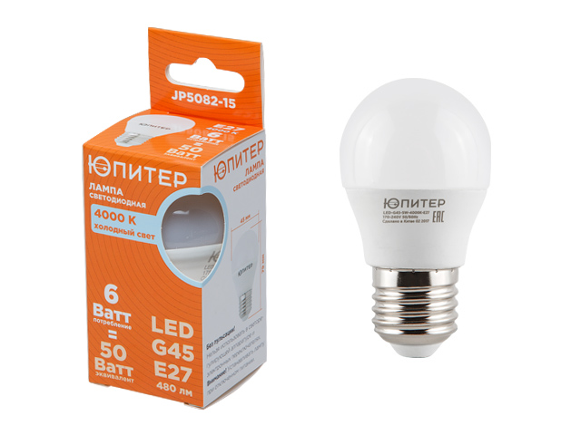 Лампа светодиодная G45 ШАР 6 Вт 170-240В E27 4000К ЮПИТЕР (45 Вт аналог лампы накал., 450Лм, нейтральный белый свет)