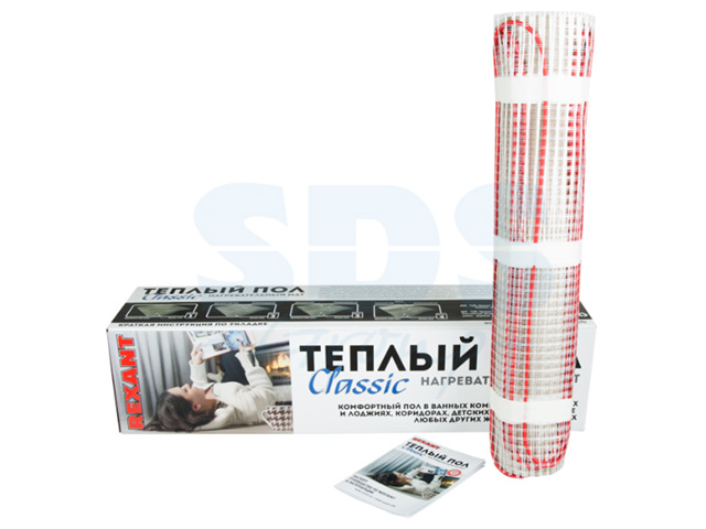 Гарантийный срок:20летНагревательные маты REXANT Classic с поверхностной мощностью тепловыделения 150 Вт/м2 изготовлены из тонкого двухжильного нагревательного кабеля и применяются в системах <Теплый пол> для комфортного подогрева помещений с покрытием пола из керамической плитки или другого аналогичного материала.Нагревательные маты устанавливаются под цементно-песчаную стяжку (толщина стяжки около 20 мм) или плиточный клей (толщина слоя плиточного клея 5-7 мм).Технические характеристики:Напряжение питания - 220 В, 50 Гц;Поверхностная мощность тепловыделения - 150 Вт/м2;Наружный диаметр тонкого нагревательного кабеля, не более - 4,8 мм;Силовой шнур нагревательного мата - ШВВП 3х0,75;Длина силового шнура - 2,0 м;Изоляция тонкого нагревательного кабеля - сшитый полиэтилен;Первый экран - медные луженые проволоки;Второй экран - алюминиевая фольга;Оболочка - ПВХ пластикат повышенной теплостойкости;Температура на оболочке нагревательного кабеля при температуре окружающей среды +20°С : 44°С.ТЕРМОРЕГУЛЯТОР В ЕОМПЛЕКТ НЕ ВХОДИТ