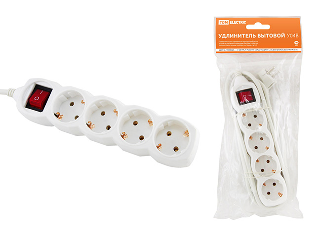 Удлинитель бытовой У04В выключатель, 4 гнезда, 3метра, с заземлением, ПВС 3х1мм2 16А/250В TDM